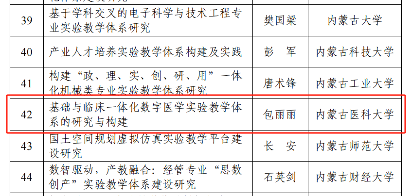 近日,教育部发布《教育部高等教育司关于公布实验教学和教学实验室建设研究项目立项名单的通知》(教高司函〔2024〕6号),学校教务处积极组织遴选、多渠道推荐,基础医学院包丽丽教授主持申报的“基础与临床一体化数字医学实验教学体系的研究与构建”获得立项,这是我校首次获批教育部实验教学和教学实验室建设研究项目。