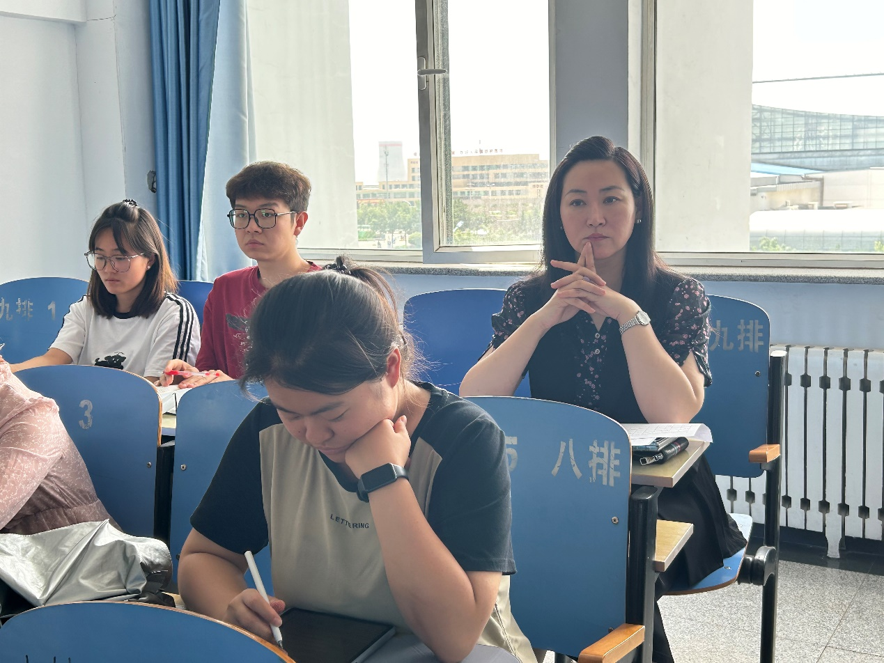 在听课过程中,薛明明副校长详细记录听课内容,仔细观察学生上课状态和课堂氛围,并对教学过程、教学方法、教学效果等情况进行全面了解。课间,薛明明副校长与授课教师进行了充分交流,对认真负责、热情饱满的授课教师表达了充分的肯定,同时对教学内容的思教结合提出进一步的期许,鼓励青年教师在教学研究改革、人才培养等方面继续积极探索,不断提高课堂教学效果,稳步提升学校教学质量,推动学校教育工作实现质的飞跃。