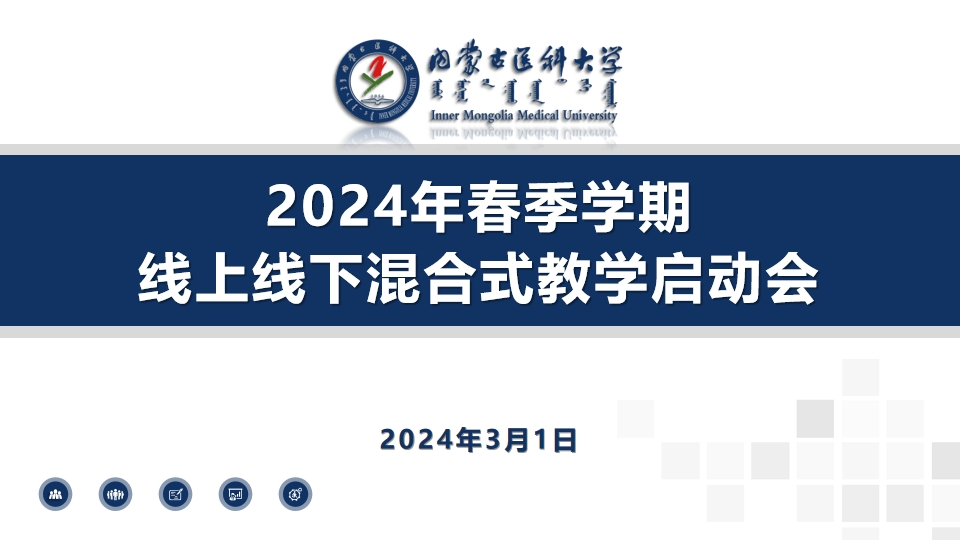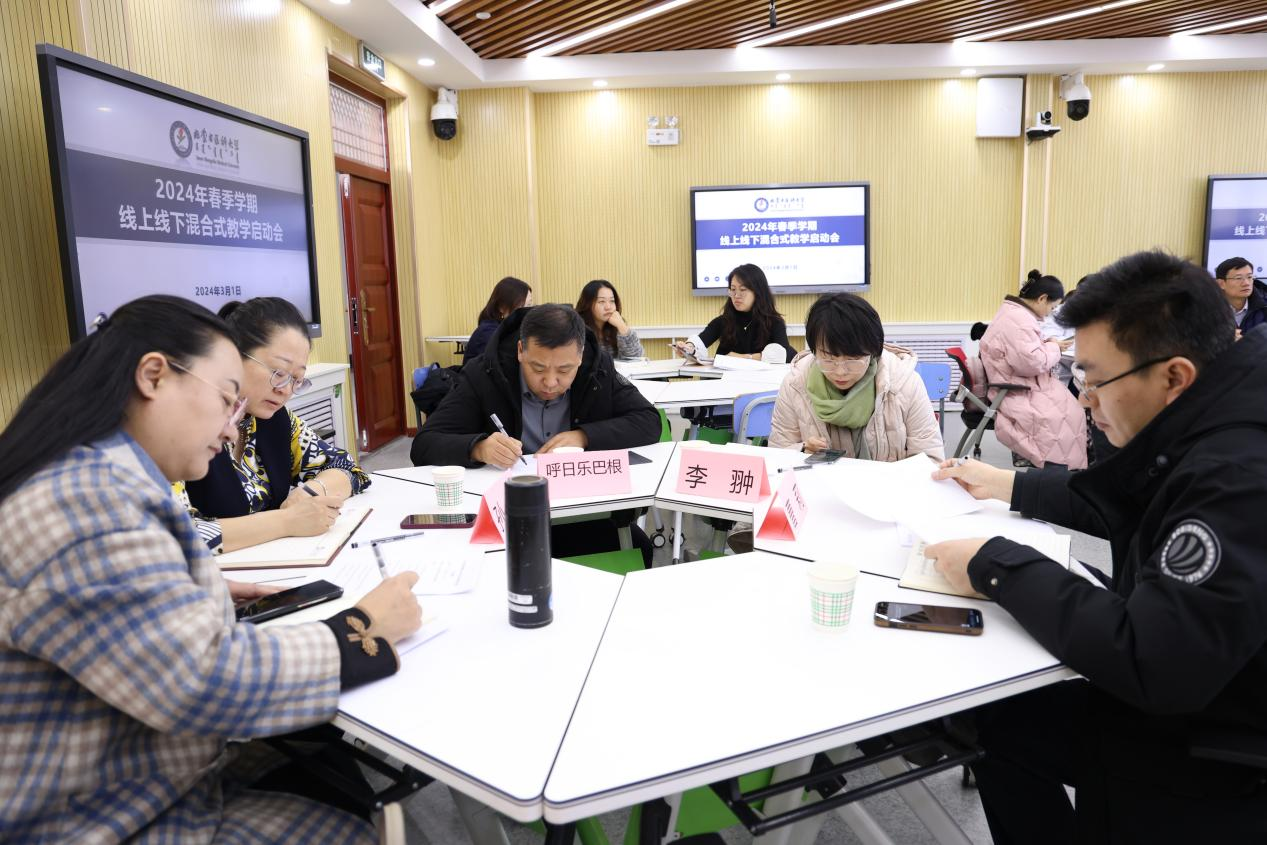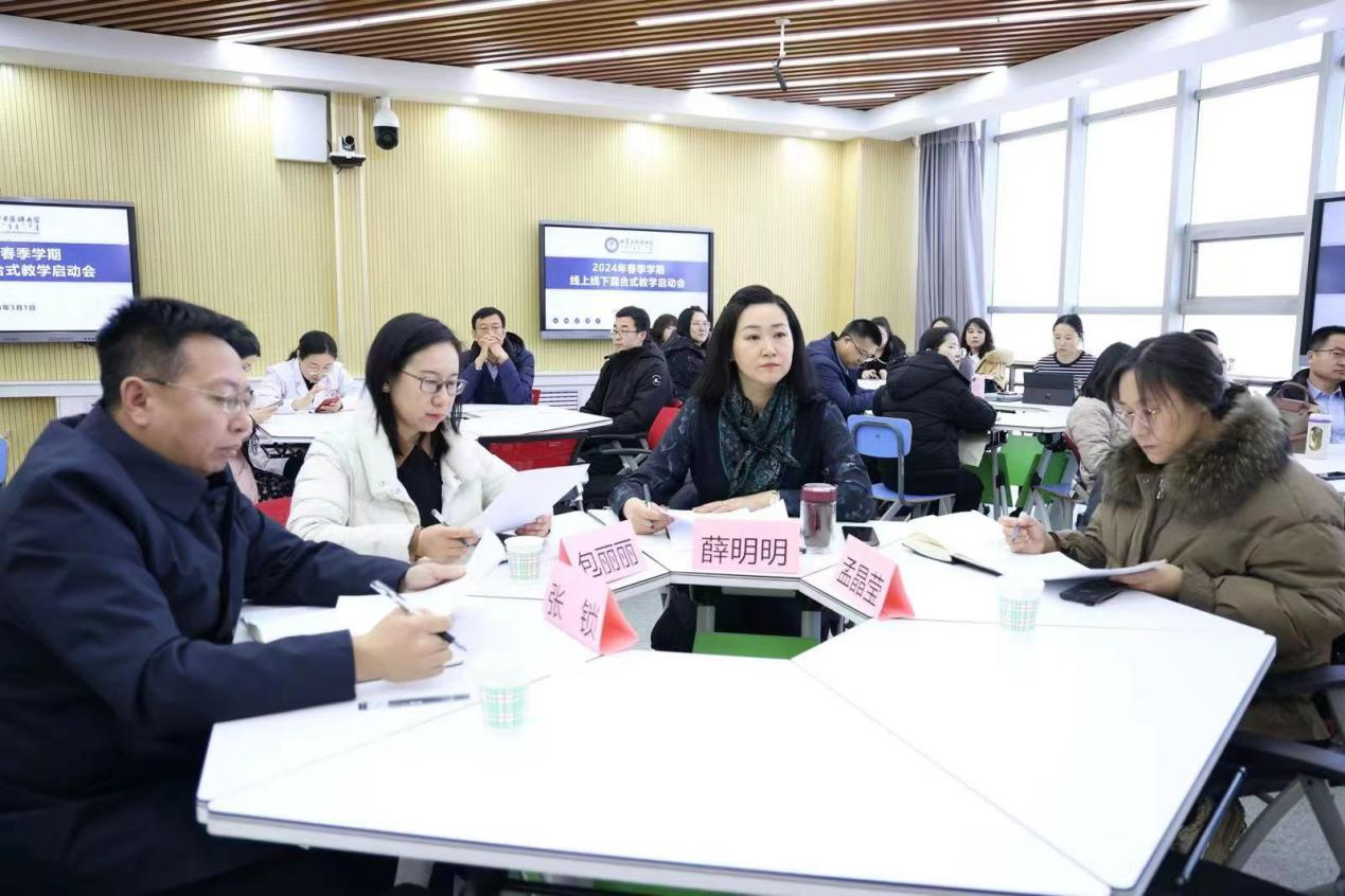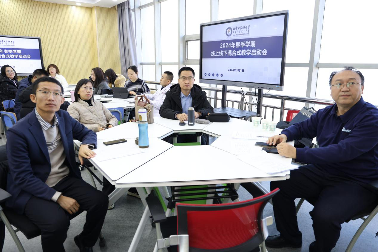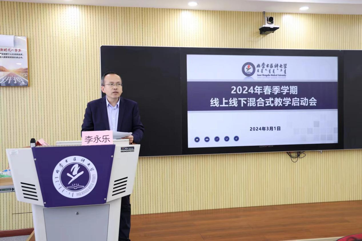 2024年3月1日上午,学校在金山校区教学北楼205智慧教室召开2024年春季学期线上线下混合式教学启动会。学校党委委员、副校长薛明明、教务处副处长李永乐、基础医学院副院长包丽丽、中医学院副院长张锁、蒙医药学院副院长呼日乐巴根、卫生管理学院副院长孙静、计算机信息学院副院长曹莉、护理学院副院长李翀、第一临床医学院教学部副部长孟晶莹以及学校2023年度、2022年度立项的线上线下混合式试点运行课程负责人、团队成员参加了此次启动会。会议由教务处副处长李永乐主持。