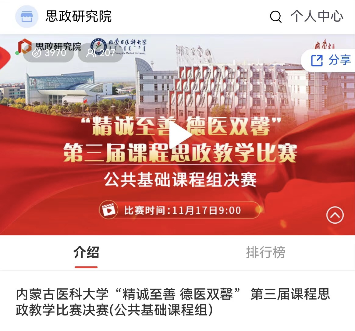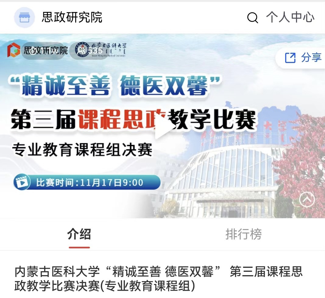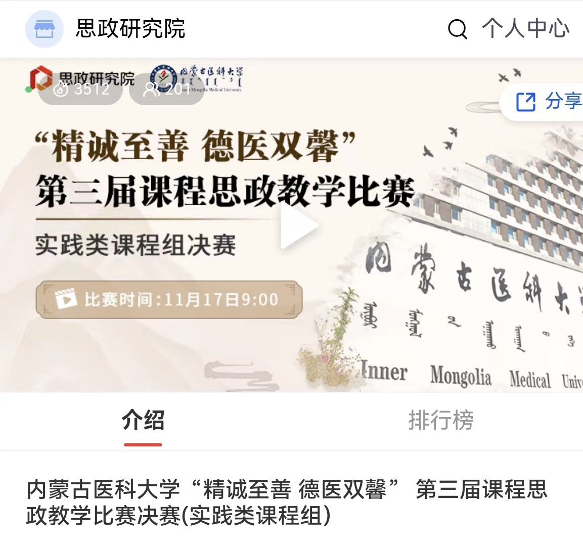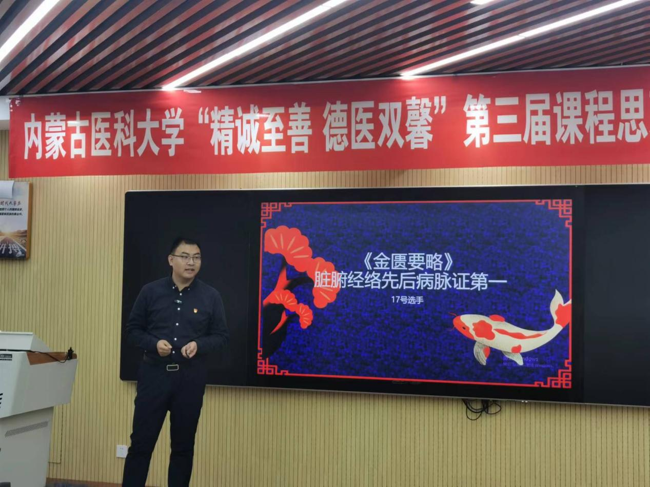 2023年11月17日,内蒙古医科大学“精诚至善 德医双馨”第三届课程思政教学比赛圆满落下帷幕。本次比赛分为专业教育课程组、公共基础课程组、实践类课程组,三个组别比赛同时线下进行,并采用网络直播方式供广大师生观摩学习。