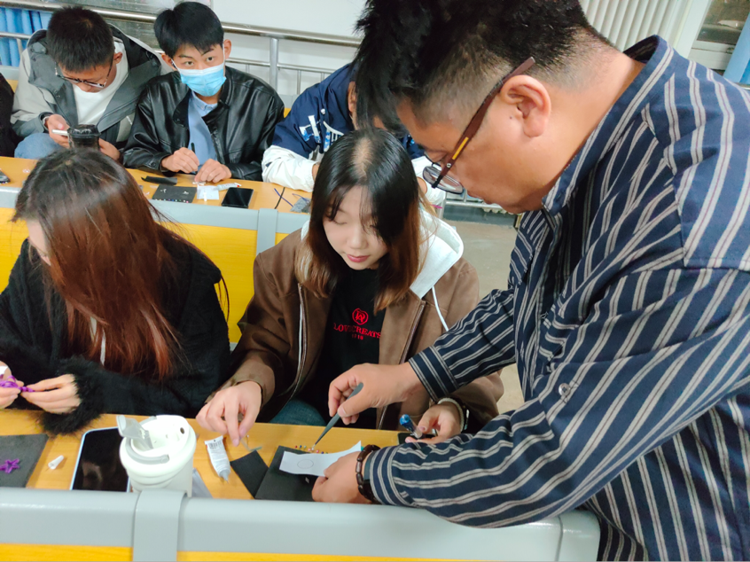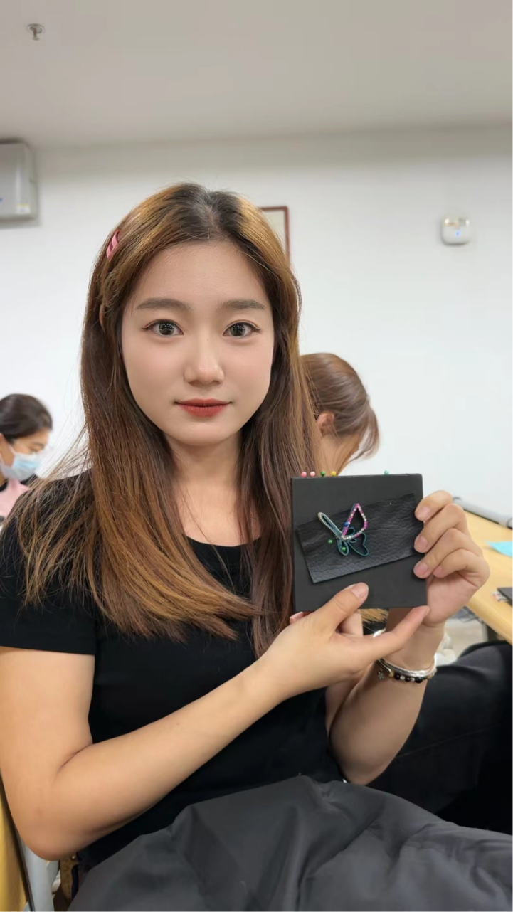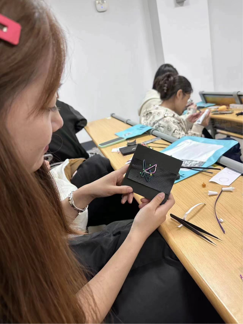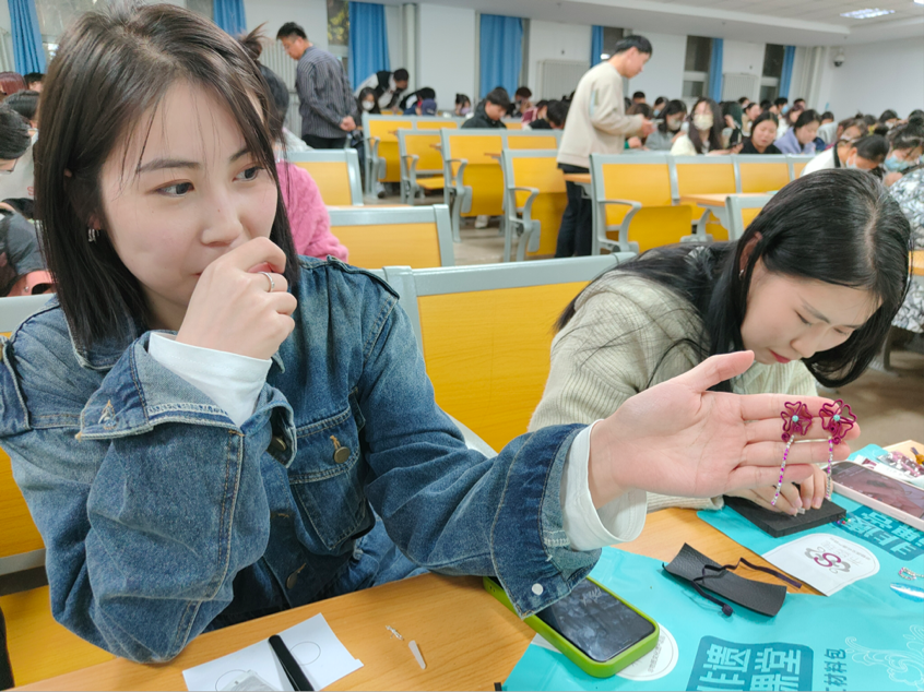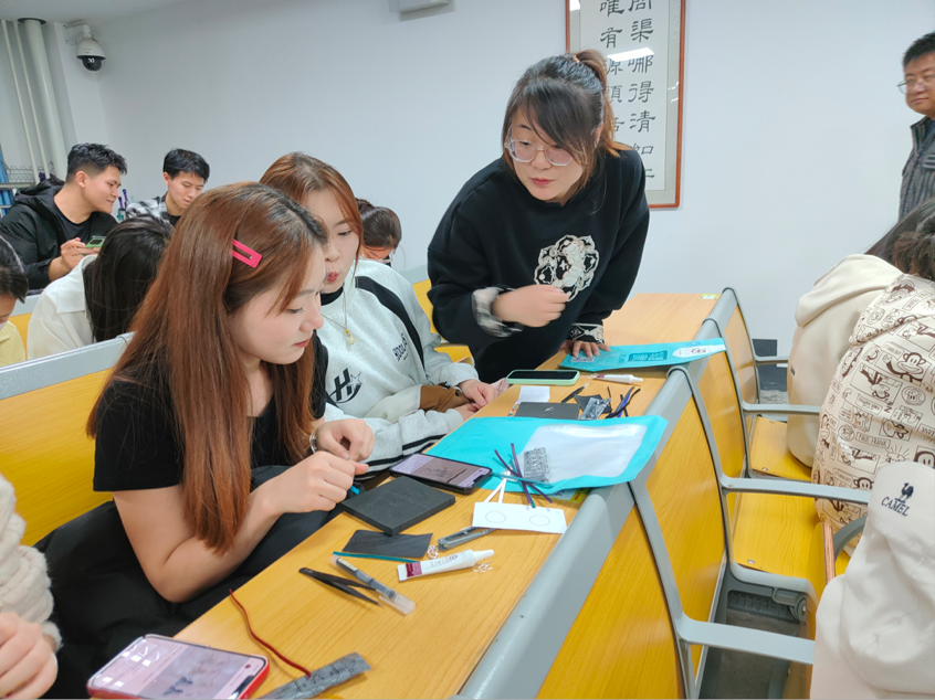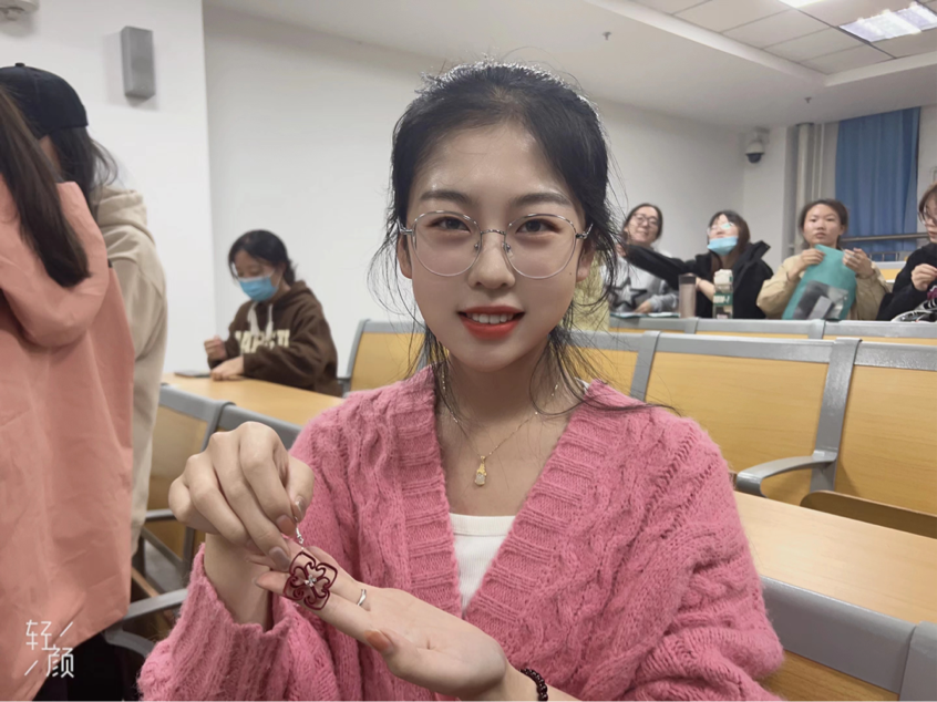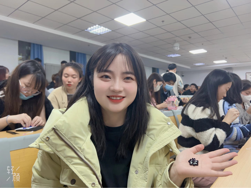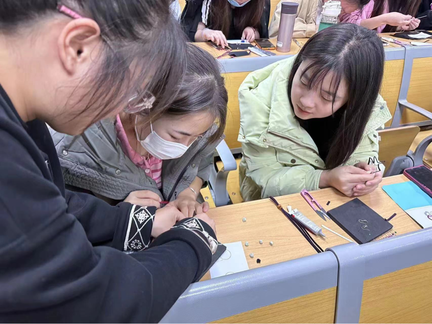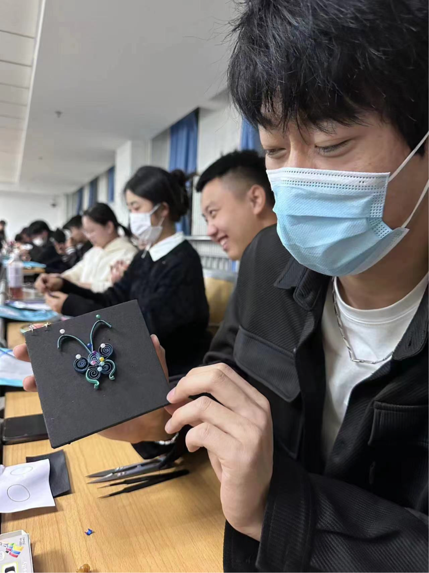 盘一方惊艳,扣一丝心弦。一盘一扣,美,不过在方寸之间。同学们兴致勃勃,在“做中学,学中做”,通过了解和亲自制作样式繁多的盘扣,一同感受这一领间中国符号的东方韵味,沉浸于中国非遗传统技艺之美中,亲身体会到了创造性劳动带来的快乐,不仅增强了文化自信,还激发起了学习和传承中华优秀传统文化的热情,纷纷表示在日后的学习过程中要不断精进自己,将“盘花扣精神”内化于心,外化于行。