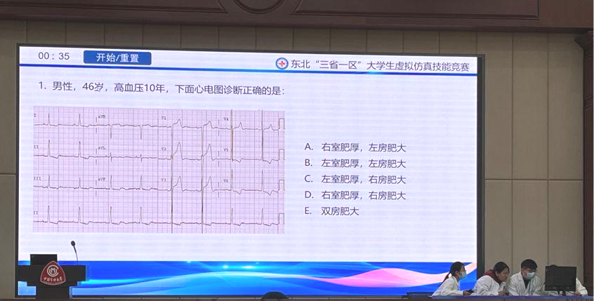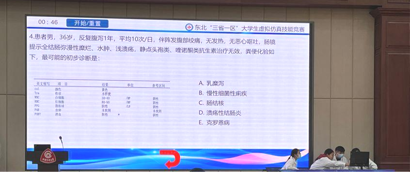 本届大赛的决赛包括理论知识竞赛和虚拟仿真实验项目操作两个环节。知识竞赛部分将各参赛队伍分组,采用擂台赛模式现场答题,内容涉及心电图、影像片、心肺听诊、实验室检查、病历分析等。虚拟仿真实验项目以项目操作与个人答题相结合的方式进行,内容包括临床基本操作、基础医学理论、临床医学案例等。不仅考察了医学生对医学知识的掌握程度,更着重考察了学生们的实践能力、创新能力和团队协作能力。
