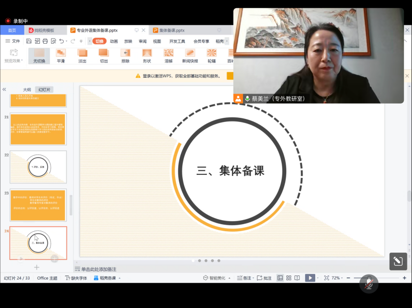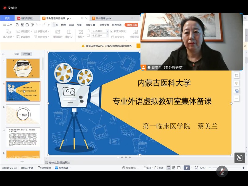2023年8月29日上午9:30,学校临床医学专业外语虚拟教研室通过线上平台,组织开展了2023年秋季学期集体备课活动。由专业外语虚拟教研室主任,第一临床医学院蔡美兰教授主持,副主任包头临床医学院贺钢枫、通辽临床医学院孙笑以及各临床医学院专业外语教研室负责人、教学秘书、骨干教师等34人在线参加了集体备课。