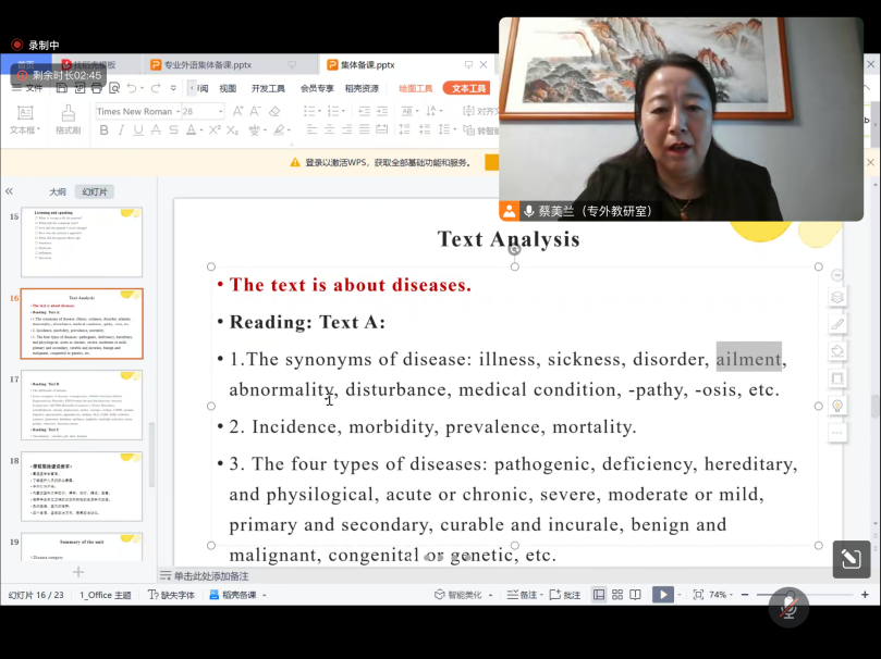 本次集体备课作为学期初的整体性备课,由蔡美兰主任从教学大纲、课程教材、教学目的、教学方法、重点难点、课程思政、评价反馈等七个方面,整体介绍了《医学专业英语》课程的基本情况,并对教学学时、授课对象、教学方法等内容进行了细致全面的分析。随后,以课程第二单元“Unit 2 Disease”为例,详细介绍了《医学专业英语》课程中词汇、语法、阅读理解等重点内容的教学方法和课程思政元素融入的经验,并针对教学难点部分展开了深入的研讨。本次集体备课活动,汇聚了各临床医学院授课教师的集体智慧,以老带新、集思广益,发挥了专业外语虚拟教研室的积极作用,开启了专业外语课程的共建共享,为提升临床教学质量奠定了基础。