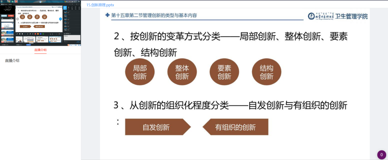 转为线上实习指导的教学单位按照实习教学科室轮转进度安排,共开设线上实践技能培训课程40门(自建课程15门,转播网络资源课程25门),本周开出线上实践技能培训课程1090节次,2180学时,涉及授课教师249人,分别使用了超星学习通、钉钉会议、尔雅通识课、腾讯会议、智慧树、中国继续医学教育、芝士猫教育网、智慧医学云平台等8个教学平台。
