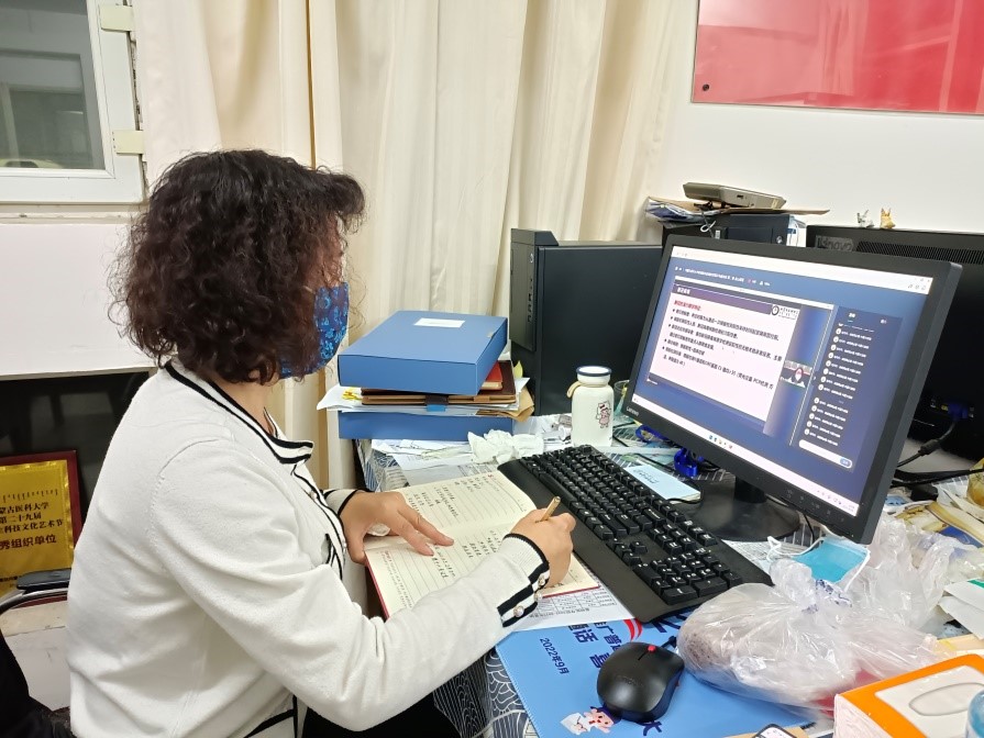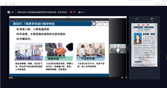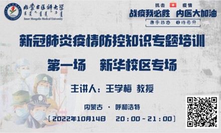 此次培训邀请到了内蒙古医科大学公共卫生学院院长王学梅教授。王教授全面介绍了驻呼高校目前的疫情防控形势,为在校学生认真科普了疫情防控知识及注意事项,并围绕奥密克戎新变异株BF.7的特点、易感人群、感染后的症状、疫情监测及处理机制等方面,详细解读了《新型冠状病毒肺炎防控方案(第九版)》。