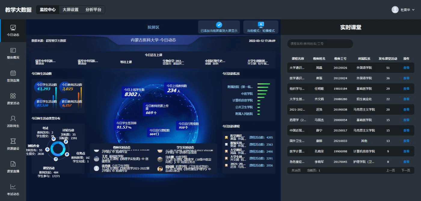 教务处提前制定了第二周教学检查安排表,全体教学管理人员按照检查安排,结合第一周教学检查反馈情况,每天利用内蒙古医科大学教学大数据分析平台对全校线上教学运行情况进行线上巡查,每天实地深入医学模拟中心各技能训练室进行线下检查,加强教学检查的针对性和效果。学校教学督导委员会15位专家本周重点对基础医学院、中医学院、蒙医药学院、二附院、赤峰临床医学院等21个二级教学单位78门次课程进行了督查,其中线上直播/录播课程56门次,线下实践技能培训课程22门次。各教学单位领导、教学管理人员及教学督导成员继续开展内部教学检查,登陆线上教学平台通过实时听课方式对教师课堂教学情况进行督导。