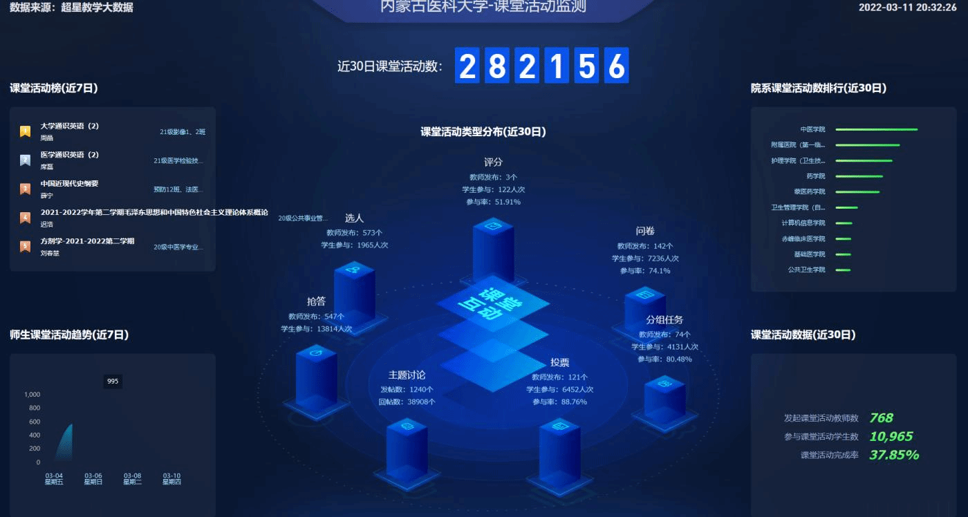 在新冠肺炎疫情影响下,为保障学校教学工作运行平稳,根据自治区教育厅有关要求、学校疫情防控工作总体安排,及《内蒙古医科大学2022年春季学期疫情防控期间教学工作实施方案》(内医教发〔2022〕5号)有关文件精神,学校第二周本科教学继续采取线上教学为主的形式进行,落实“返校迟、学习不迟,课堂停、课程不停”基本原则。教务处对第二周教学运行情况进行了系统梳理,现报告如下。