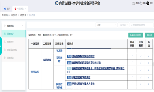 教务处前期完成了《内蒙古医科大学本科专业综合评估实施方案》的制定;专业综合评估研讨会的召开;药学、公共事业管理、法医学专业评估指标体系的确定;第三方评估公司的引入;内蒙古医科大学专业综合评估平台的定制等准备工作。在此基础上启动三个专业的综合评估工作,探索学院自评与第三方评估相结合的一种高校新型专业评估模式,为全校所有专业的评估做好全面准备。要求三个专业所在学院高度重视,做好学院内部动员,认真梳理专业办学中的问题,圆满、按时完成本次评估工作。