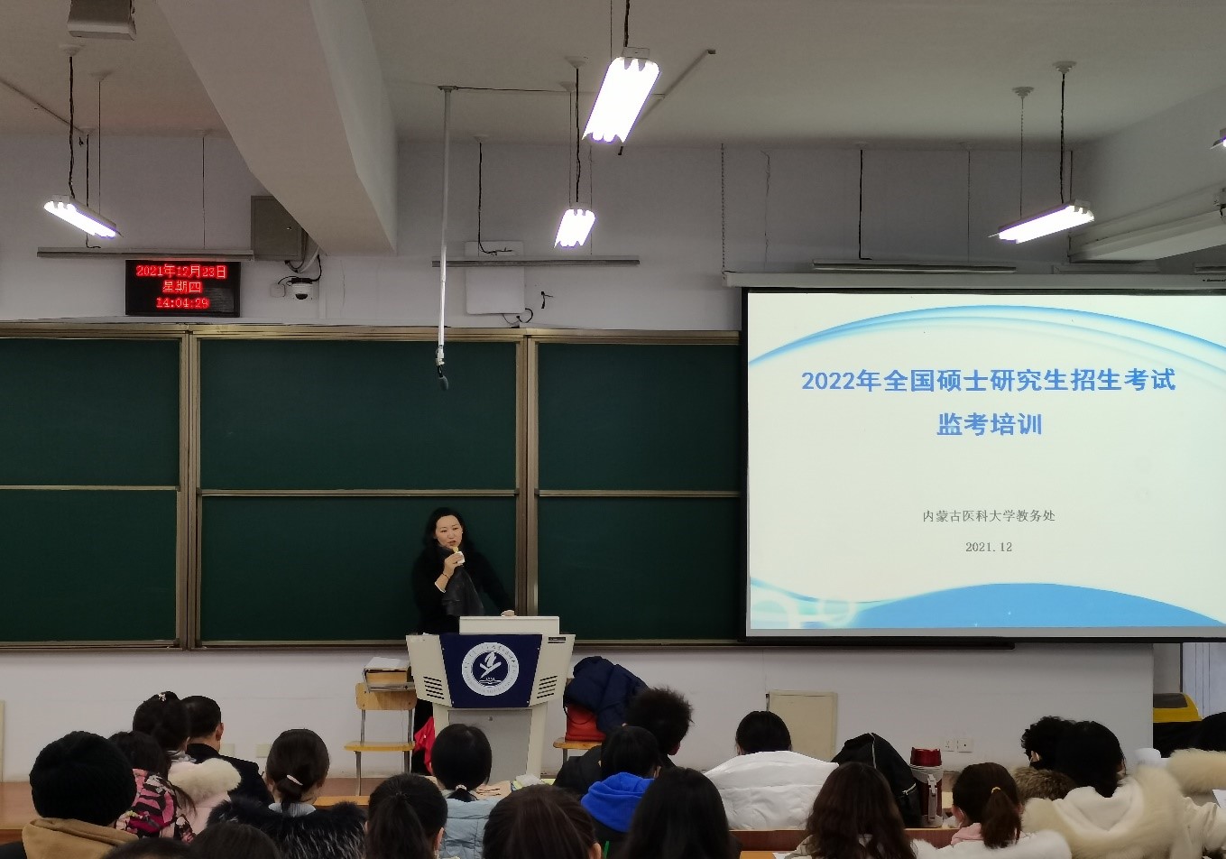 为了增强责任意识,明确我校国家教育统一考试考务人员及监考人员的工作责任,确保2022年全国硕士研究生招生考试安全保密和考风考纪良好,维护考试的权威性和公信力,根据《中华人民共和国教育法》《国家教育考试违规处理方法》《关于实行高等学校招生考试工作责任制及责任追究暂行办法》《国家教育考试考务安全保密工作规定》《新冠肺炎疫情防控常态化下全国大学英语四六级考试组考防疫工作的指导意见》,结合《中华人民共和国刑法》(修正案九)等法律规定,以及国家、自治区及学校相关考务工作规定,2021年12月23日下午14:00,学校在金山校区教学北楼101教室召开了“2022年全国硕士研究生招生考试监考教师培训会 ”。