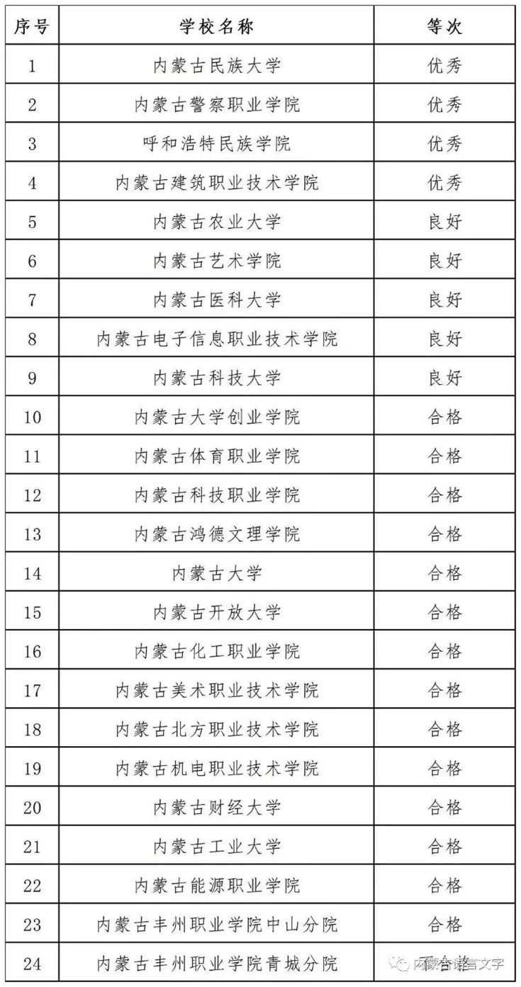 本次视频会议通报了2021年10月国家通用语言文字规范化达标校评估结果,24所受评的自治区直属高校中,内蒙古民族大学等4所高校获得优秀等级、内蒙古医科大学等5所高校获得良好等级、内蒙古大学创业学院等14所高校获得合格等级。