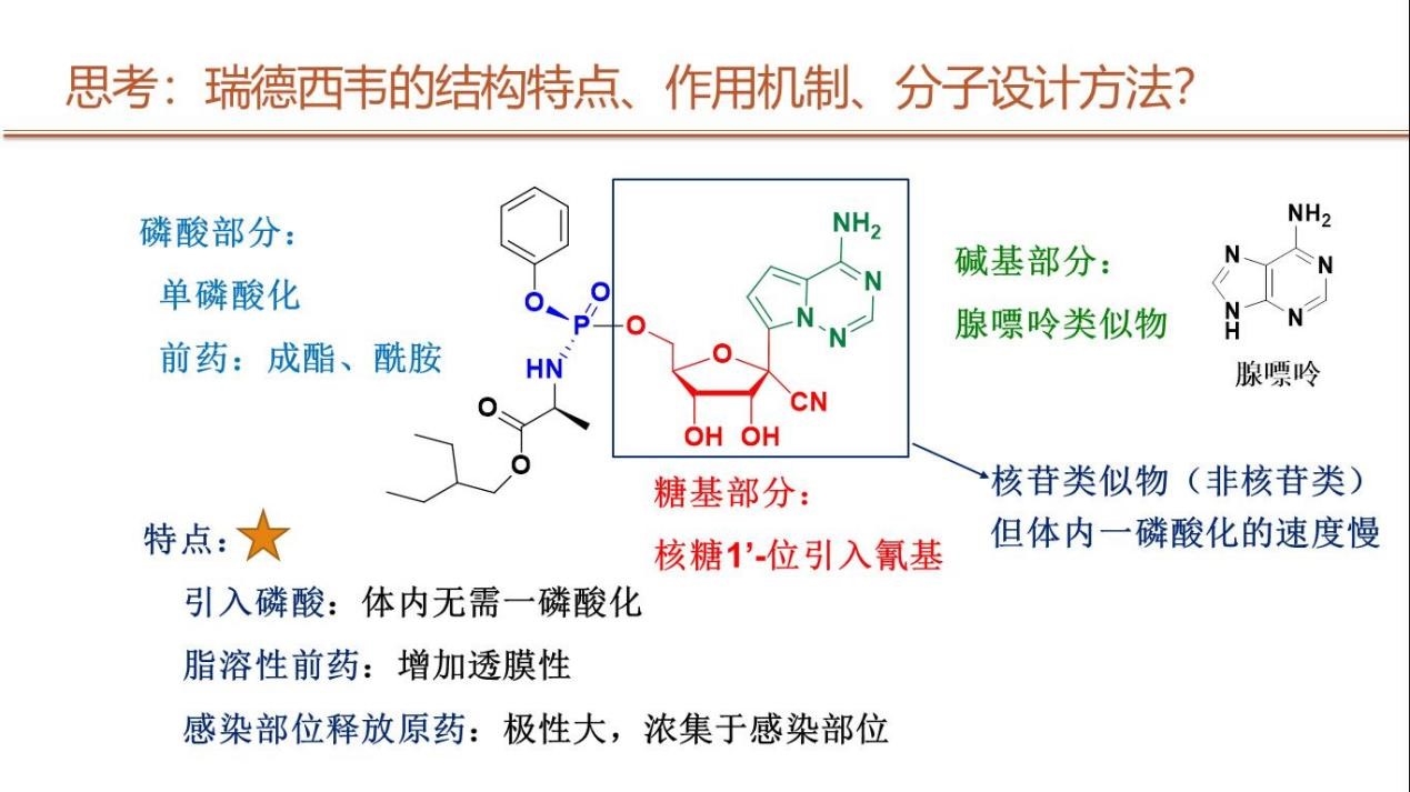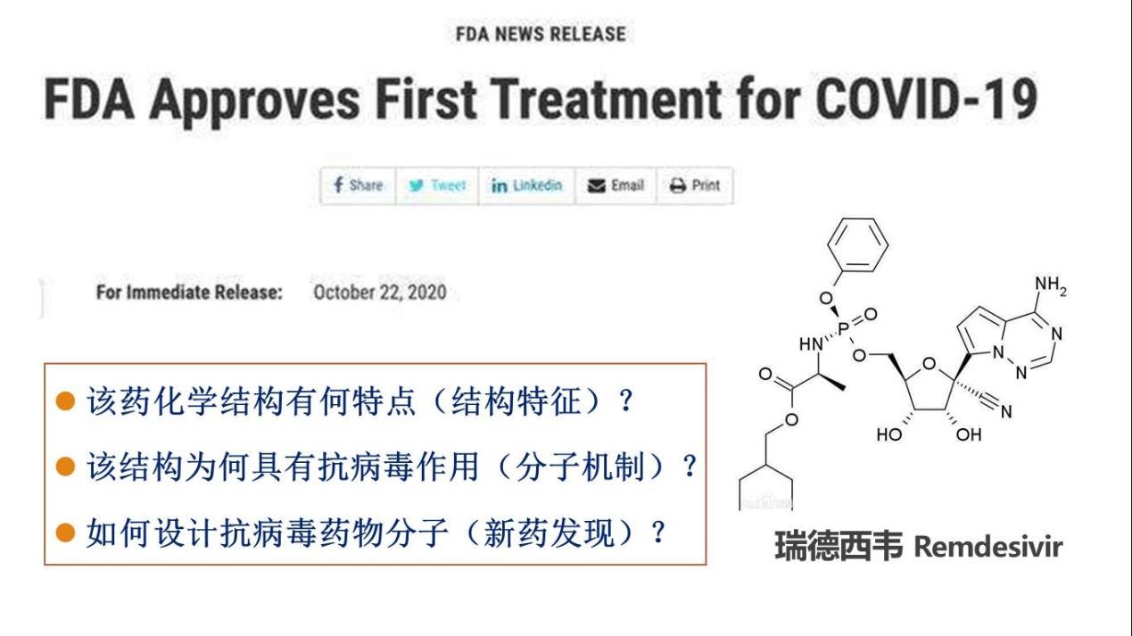 2.从抗病毒药物的分子设计这一知识点引入抗新冠病毒药物瑞德西韦的设计案例,通过案例教学,解析药物的设计思路,引导学生建立抓住主要矛盾分析和解决问题的方法论;通过课后科研文献的阅读与讨论,培养学生勇于探索和不断创新的科学精神。