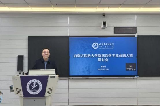 3月12日上午,学校在新华校区教学实验综合楼206教室举办了临床医学专业命题大赛研讨会。此次研讨会特别邀请人民卫生电子音像出版社有限公司副总经理董良广和中国医科大学教务处副处长于宏担任主讲嘉宾。基础医学院、第一临床医学院50余名教师现场参会,呼和浩特以外各临床医学院20余名教师线上参会。会议由教务处副处长高尚主持。
