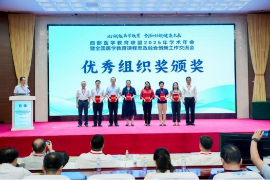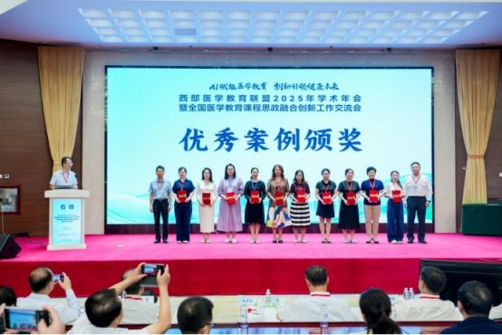 颁奖环节,共有16所医学院校的19篇论文被评为“西部医学教育联盟2025年学术年会优秀征文”。近百所院校的400份案例获得“首届医学教育课程思政案例大赛”奖,其中一等奖20名、二等奖40名、三等奖80名、优秀奖260 名、优秀组织单位10家。我校基础医学院教师张曙光获得优秀征文一等奖,教师潘海婷获得课程思政案例二等奖,教师恩和吉日嘎拉获得课程思政案例优秀奖。内蒙古医科大学获得优秀组织单位奖。