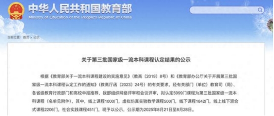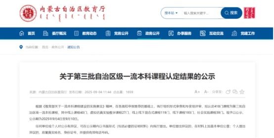 2025年8月至9月,教育部与内蒙古自治区教育厅相继公示第三批国家级和自治区级一流本科课程认定结果。我校有7门课程获评国家级一流本科课程,覆盖四个类别;26门课程入选自治区级一流课程,实现五大类型全覆盖。此次成绩标志着学校在一流课程建设中取得前所未有的重大进展,是学校持续深化教学改革、聚力“晋位升级”进程中取得的显著成果。