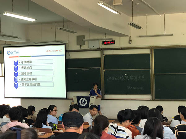 教务处考务中心韩老师对参与考试的监考教师进行了考前培训,详细介绍了考试流程,并强调了需要注意的事项和考试的纪律,以保证考试平稳顺利进行。
