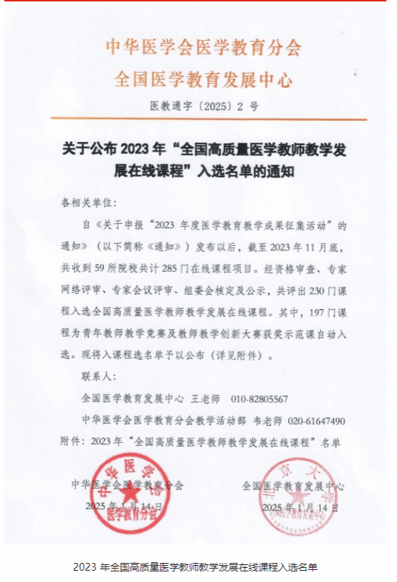近日,从中华医学会教育分会和全国医学教育发展中心传来喜讯,我院骨科刘瑞教学团队精心打造的《运动系统损伤与疾病》课程凭借先进的教学理念、创新的教学方法及卓越的教学效果,成功入选全国高质量医学教师教学发展在线课程。