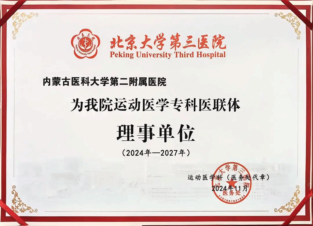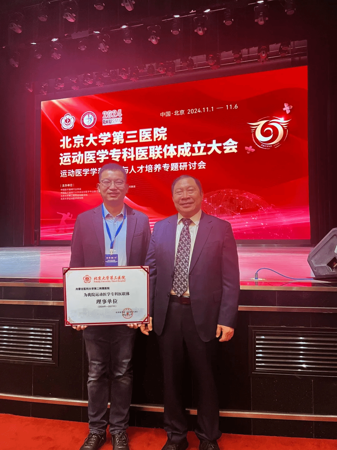 11月1日,北京大学第三医院运动医学专科医联体成立大会暨运动医学学科建设与人才培养专题研讨会在北京成功举办。会上,我院正式成为北京大学第三医院运动医学专科医联体理事单位。运动医学中心A区副主任贾岩波前往北京参会,并在大会上领取了理事单位证书。 这一殊荣的获得,是对我院运动医学中心长期以来不懈努力的肯定,更是对未来发展的巨大鼓舞,同时标志着我院与北医三院运动医学研究所实现了深度合作,开启了运动医学专业的新征程。