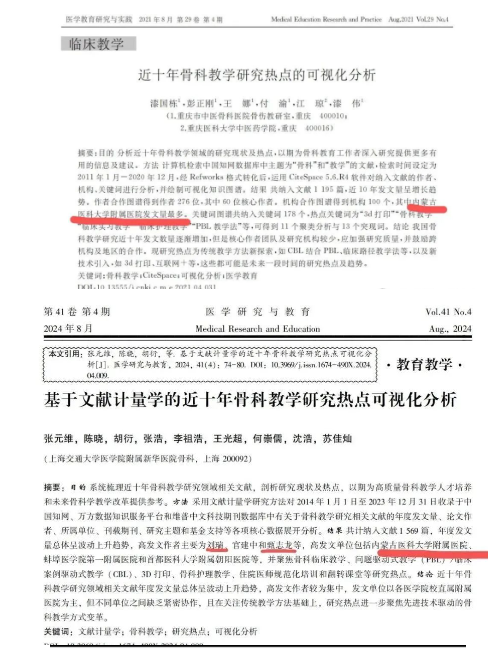 近日,杂志《医学研究与教育》中《基于文献计量学的近十年骨科教学研究热点可视化分析》一文采用文献计量学研究方法,对2014年1月1日至2023年12月31日收录于中国知网、万方数据知识服务平台和维普中文科技期刊数据库中有关于骨科教学研究相关文献的年度发文量、论文作者、所属单位、刊载期刊、研究主题和基金支持等各项核心数据进行了分析。结果显示我院骨科刘瑞教授、甄志龙医生分别发表论文21篇、9篇,位列个人发表论文数排行榜第一和第三,我院是近十年发表骨科教学研究相关论文最多的医院,是名副其实的骨科教学医院。
